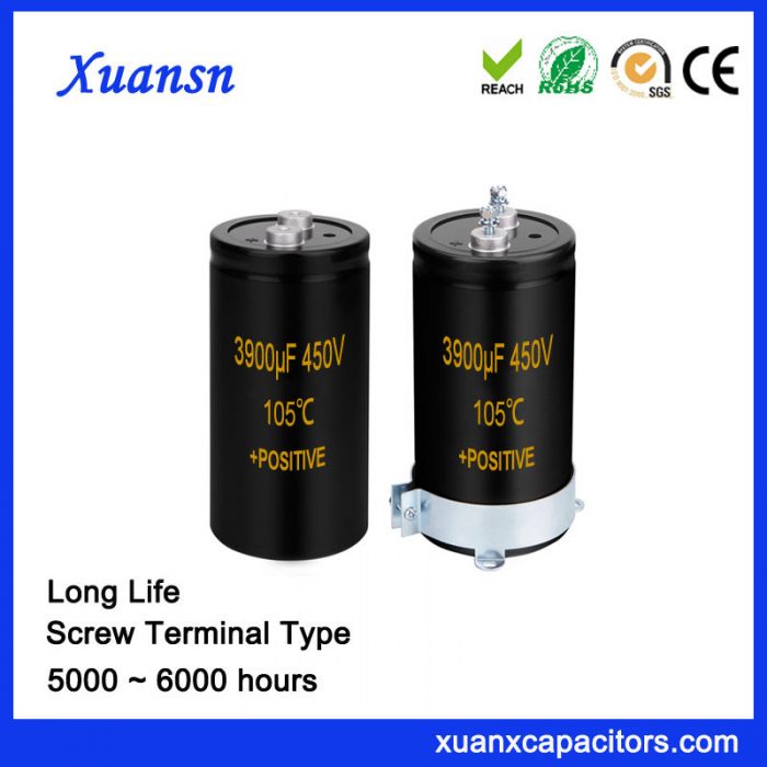 Xuansn manufacturing and supply of 6000 hours 105℃ 3900UF 450V Screw Terminal Capacitor.