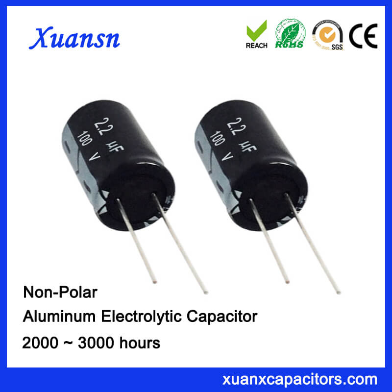 Radial Alulminum Electrolytic Capacitor 2.2uf 100v is our 2000 to 3000 hours non-polarity series. The non polarity radial alumium electrolytic capacitor is used in circuits with reversing polarity