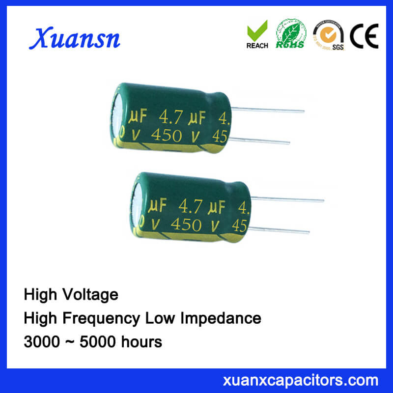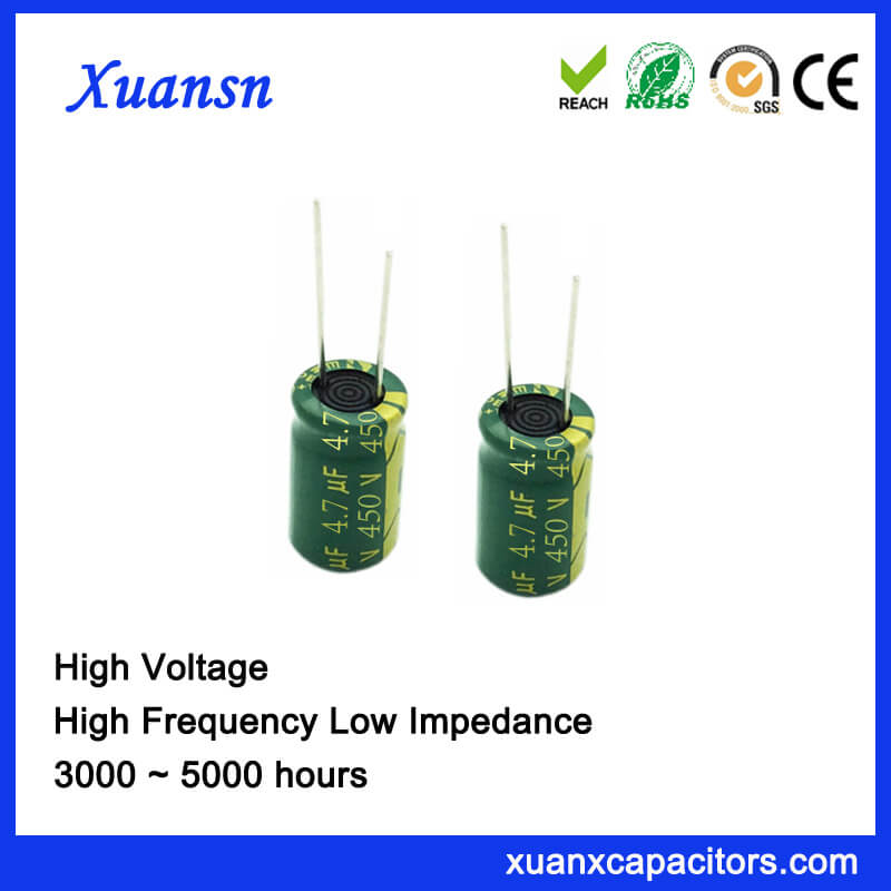 450V 4.7UF High Voltage Capacitor Low Impedance is our high voltage High frequency and low impedance electrolytic capacitor series. Its laod life is 3000 to 5000hours at 120Hz 105℃.