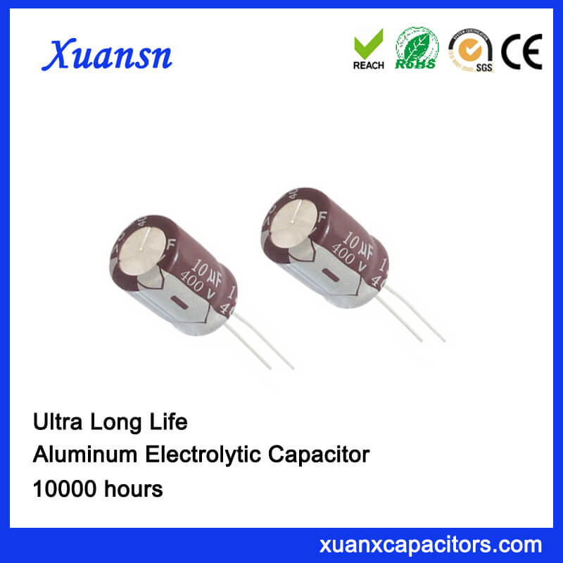 High Reliability Electrolytic Capacitors 10UF 400V is our long life series, its withstanding load life of 10000 hours at 105°C, its size is 13*21mm, its ripple current is 252mAmrs at 105℃ 120Hz.