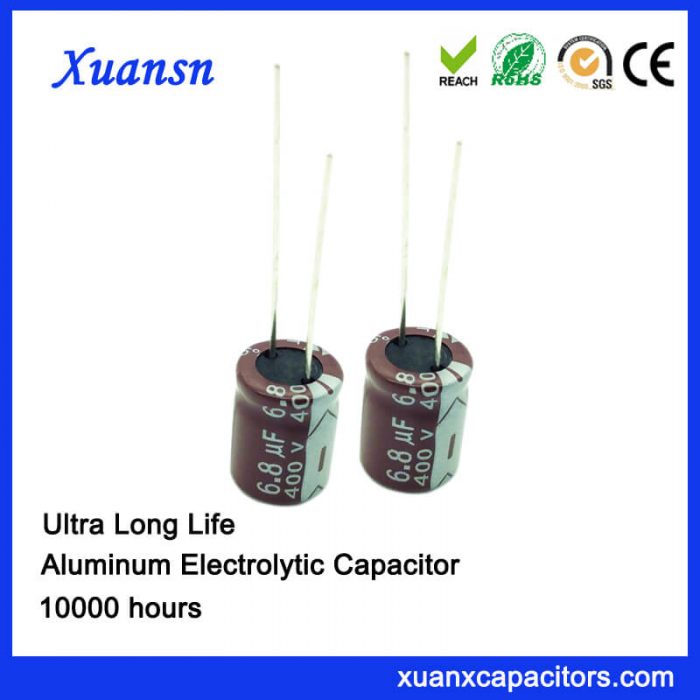 Xuansn has High Voltage 6.8uf 400v 10000hours Electrolytic Capacitor, 6.8uf 400v capacitor is our long life series, its withstanding load life of 10000 hours at 105°C, its size is 13*21mm, its ripple current is 198mAmrs at 105℃ 120Hz.