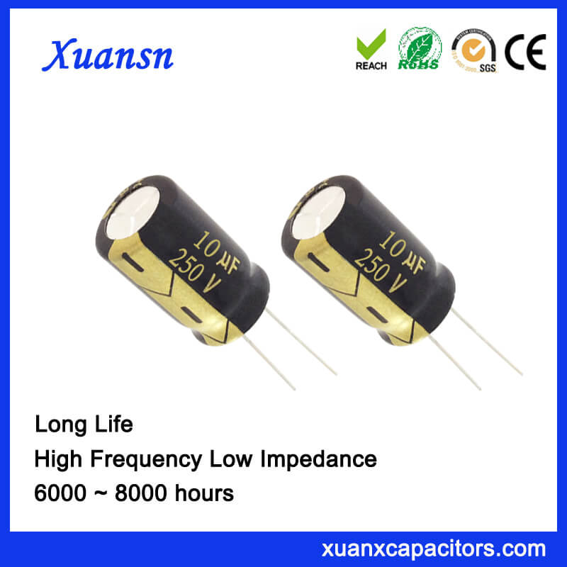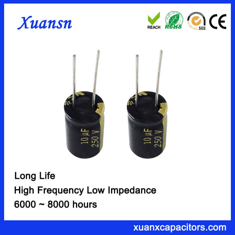 Xuansn factory manufacturing and supply of Through Hole 10UF 250V Capacitor Electrolytic Long Life.