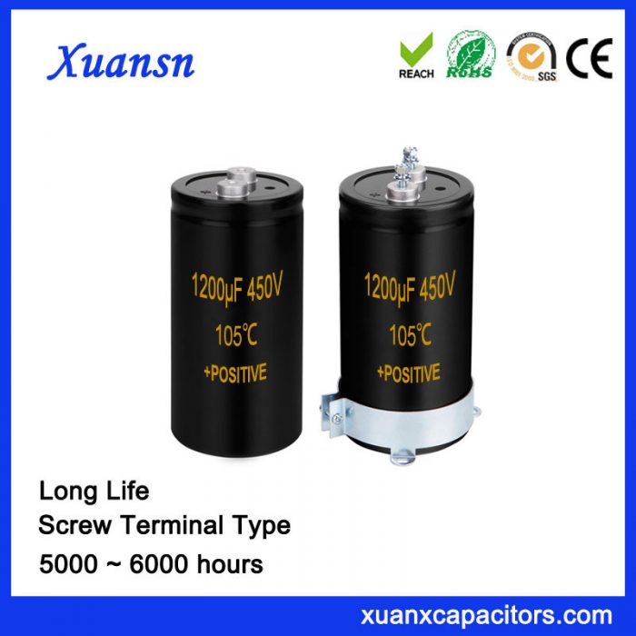 Xuansn manufacturing and supply of 6000 hours 105℃ 450V 1200UF Screw Terminal Aluminum Capacitor.