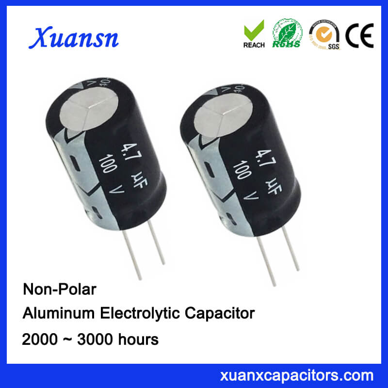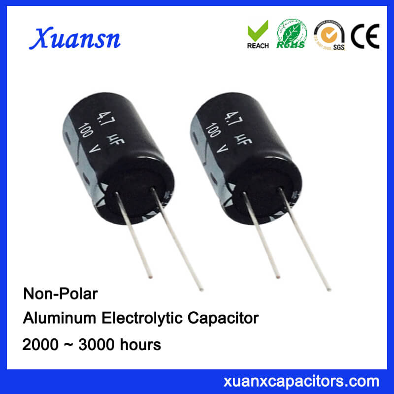 Radial Alulminum Electrolytic Capacitor 4.7UF100V is our 2000 to 3000 hours non-polarity series. The non polarity radial alumium electrolytic capacitor is used in circuits with reversing polarity
