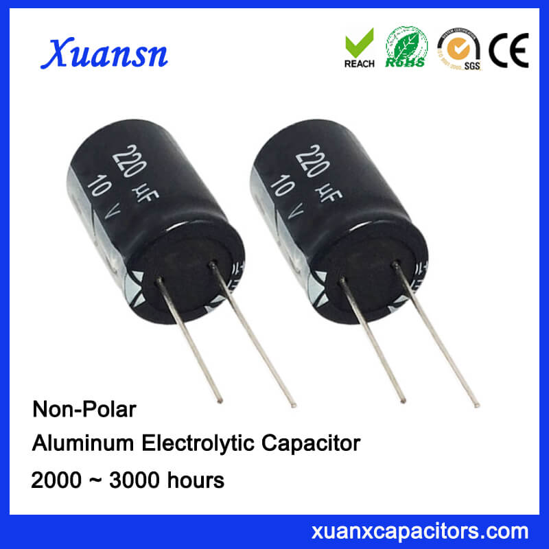 Aluminum Electrolytic Capacitor 220UF 10V new products, when the ripple current is constant (such as the rated ripple current), the higher the ambient temperature, the shorter the life of the electrolytic capacitor. In addition, if the ambient temperature is too high and exceeds the highest rated temperature of the electrolytic capacitor, the electrolyte will boil on the electrolytic capacitor to generate overpressure, and the pressure relief member will irreversibly release the pressure, causing electrolyte leakage. . XUANSN capacitors introduce new raw materials to solve the problem of high temperature resistance of electrolytic capacitors, so our products can withstand extreme temperatures of 150 degrees.
