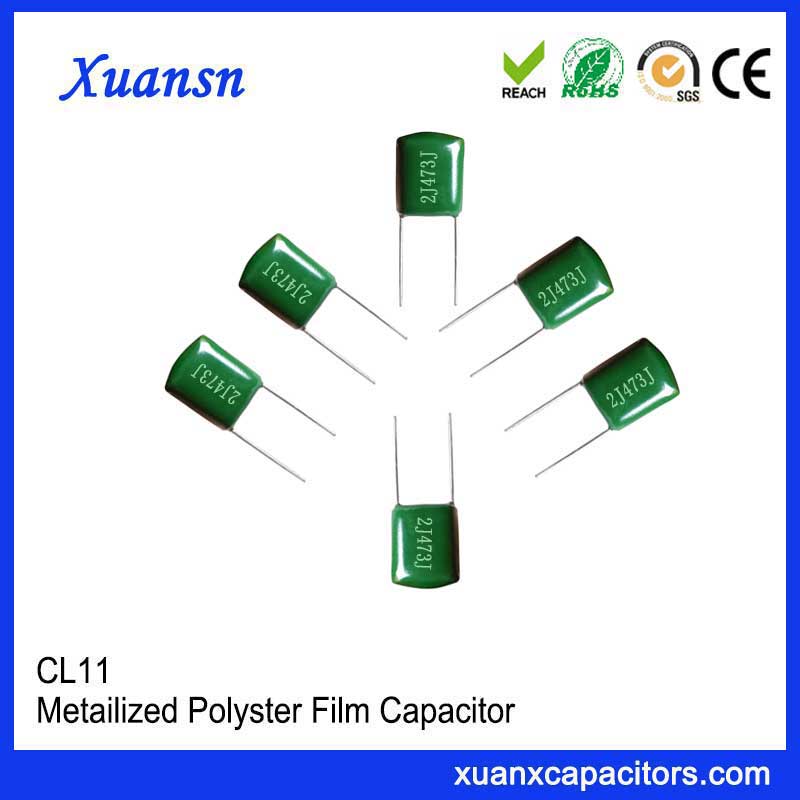 film type capacitor CL11 473J630V epoxy resin encapsulation, low loss, widely used in various electronic instruments, bypass, DC blocking and other circuits