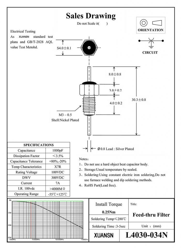 Type C filter, single capacitor structure. It is a low self-induction device that avoids high-frequency noise interference to the ground. It is suitable for signal line filtering and DC power line filtering, and is suitable for applications with high impedance sources and high loads.