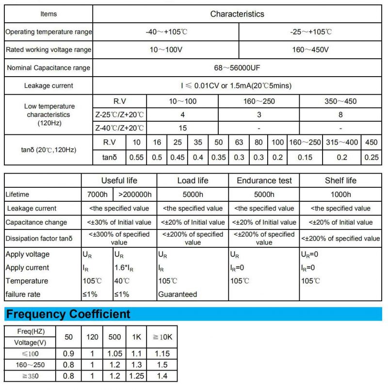 Specification of standard snap in aluminum electrolytic capacitor