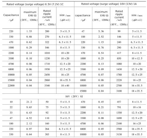 The data of CD110 series aluminum electrolytic capacitors are shown in Table 1-3 ~ Table 1-8.